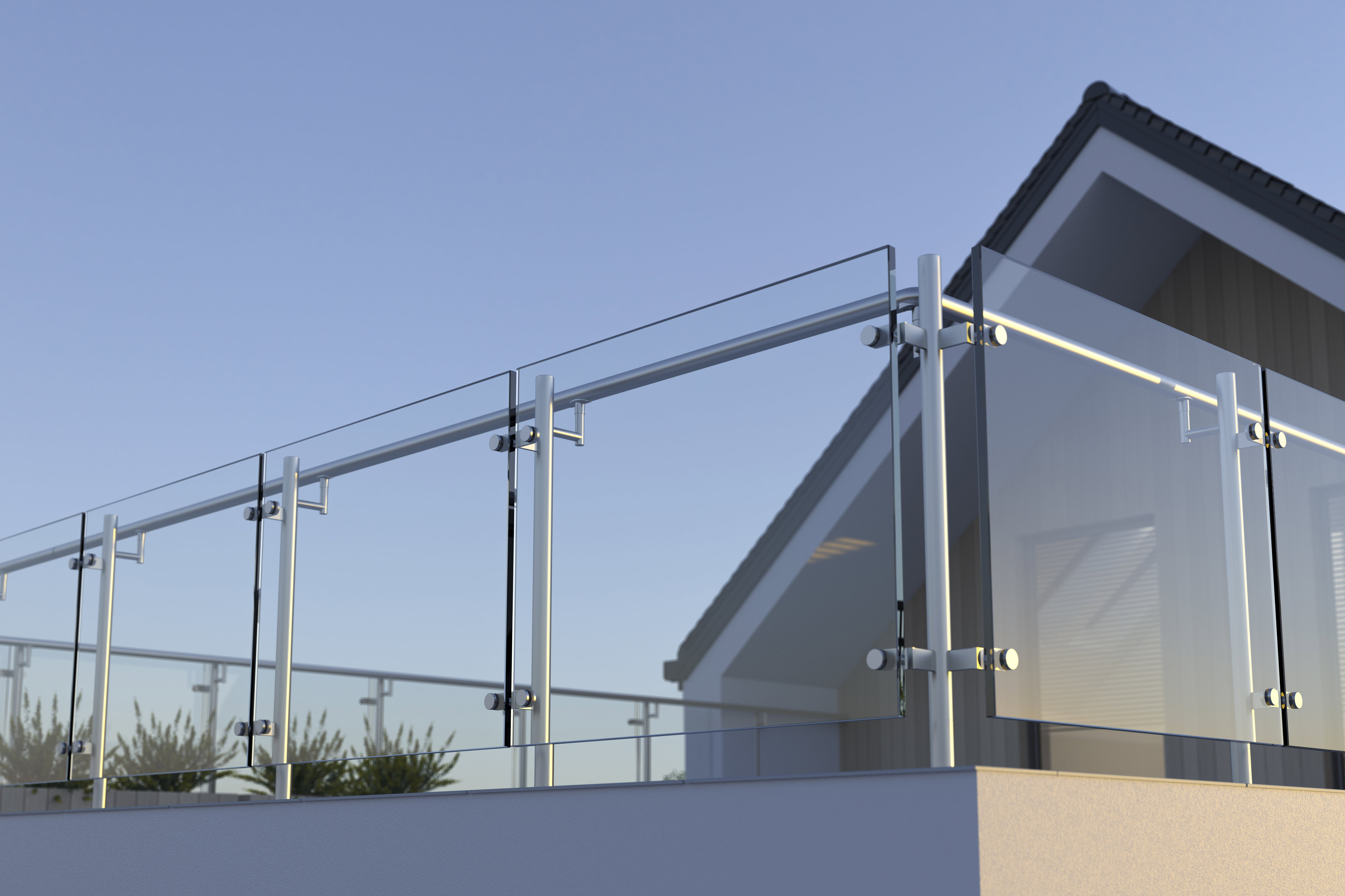 يستخدم زجاج بسماكة 10–12 ملم، مناسب للسلالم والشرفات.2) درابزين زجاج مصفح