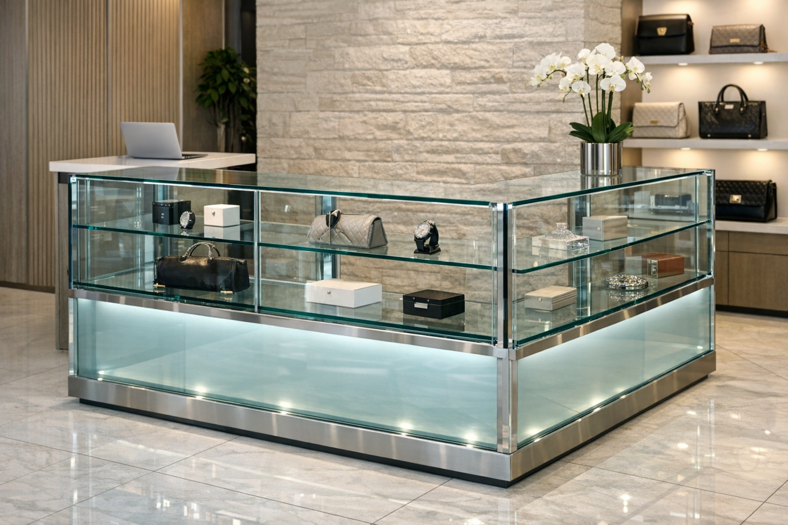 الكونترات الزجاجية هي طاولات عرض أو استقبال مصنوعة من زجاج مقسى أو مصفح، تُستخدم لعرض المنتجات أو لاستقبال العملاء.